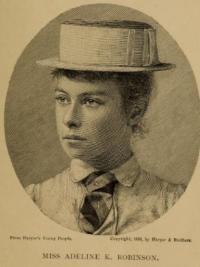 | Bio | She was an early champ from Staten Island in the 1880s. Adeline played mainly at the Staten Island Cricket and Baseball Club but competed in the 1888 National Championships where she lost in the semi-final to eventual champion Bertha Townsend after failing to convert her match point. She is mentioned in an article by Henry Slocum in Outing: "Apart from being a remarkably well-conducted institution, the ladies’ club is famous and fortunate in numbering among its members Miss Adeline Robinson, who, according to popular opinion, is the most skilful exponent of lawn tennis to be found among the women of America." |