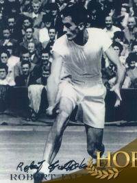 | Bio | Bob was an American amateur tennis player and entrepreneur. He is best known for winning the Men's Singles at the 1948 Wimbledon Championships and for introducing soft ice cream and American fast food to Brazil in 1952. He founded the Brazilian fast food chain Bob's. Bob Falkenburg was born in New York City and grew up in Los Angeles, California in a tennis playing family. His parents, Eugene “Genie” Lincoln Falkenburg (an engineer involved in the construction of the Hoover Dam) and Marguerite “Mickey” Crooks Falkenburg were amateur tennis players. While employed by Westinghouse, Eugene was transferred to South America, where he moved with his wife and three children to São Paulo, Brazil. There Mickey won the state tennis championship in 1927.Mickey was always involved in tennis. In the book “The Game: My 40 Years in Tennis,” renowned tennis champion Jack Kramer wrote that Mickey Falkenburg was “the first person to ever suggest to him the idea of a team-tennis league,” a league which he later created. Bob’s sister, Jinx Falkenburg, a famous American film star/model was also an amateur tennis player and his brother Tom had a successful tennis career as well. Bob started to play tennis in 1936 when he was 10 years old. Like other known tennis players from Southern California, he frequently played at The Los Angeles Tennis Club in Hollywood, which was located very close to the family home. Bob also played at the Bel-Air Country Club, where he won the junior tennis tournament in 1937 at 11 years of age. As a youngster, Bob participated in different tournaments around the city. In 1942 and 1943 while attending Fairfax High School, Bob won the National Interscholastic singles title and won the national doubles title with his brother, Tom. In 1943, Bob became the Los Angeles city singles title holder. The following year he claimed the United States doubles crown with Don McNeill at Forest Hills, NY. In 1943, Bob became one of the youngest players to enter the US Top 10 amateur ranks. He remained in the US Top 10 for 5 years. From 1944 to 1945, during World War II he served in the military as an air cadet. However, being enlisted in the service did not put a complete halt to Bob's tennis career and he continued to occasionally play while in the Air Force. In 1946, while attending the University of Southern California, he won the NCAA singles and doubles titles. He teamed again with his brother Tom Falkenburg to capture that NCAA doubles final. Bob was very agile and was known for his powerful serves. At the age of 20 he was considered to have “the fastest serve in tennis.” After marrying a Brazilian, Bob moved to Rio de Janeiro in 1950, where he played on the 1954 and 1955 Brazilian Davis Cup teams. In 1947 he paired with Jack Kramer and together they won the Wimbledon doubles title. A year later, in 1948, Falkenburg reached the pinnacle of his tennis career by winning the Wimbledon singles championship. Exceedingly tall Bob understood the limitations of his game and took full advantage of his greatest opportunity. At Wimbledon in 1948, he exploited his big serve and took calculated risks at the right times, coming away with that coveted title. In the final, the Australian John Bromwich was serving with a 5-3, 40-15 fifth-set lead over Falkenburg, but Falkenburg saved three match points and went on to win 7–5 in the fifth set. Falkenburg won Wimbledon because he was not only a great tennis player, but a great strategist. Fellow tennis player Tom Brown, who was a runner up in the 1947 Wimbledon Championships described Bob’s competitive approach, “He would review the situation, figure out what was likely, and take chances.” Bob Falkenburg not only found success on the tennis court and fast food industry, but he also had a successful amateur golf career. He played in many international golf championships and won the Brazilian amateur championship three times. He took part in renowned golf tournaments including the Bob Hope Desert Classic, where his team won in 1967; the Bing Crosby Pro-Am in Pebble Beach, where he played several times; the Eisenhower Cup, where he played for Brazil in Rome in 1964, Mexico City in 1966 and Melbourne in 1968; and the British Amateur Golf Championship, where he led the American contingent on the first qualifying round after having a hole-in-one at Carnoustie, Scotland. Bob had a total of 14 holes-in-one during his life. He also participated as an amateur in various European golf championships in France, Spain, Germany, Switzerland, Belgium and several Scandinavian countries. In 1970, the Falkenburgs moved back to Southern California and in 1974, at the age of 48, he sold the “Bob’s” chain (which at the time had 12 stores) to Libby of Brazil (later acquired by Nestlé). Retired in Los Angeles, Bob spent a lot of time playing golf at the Bel-Air Country Club, where he would often play with former Laker player and good friend Jerry West and others. Later Falkenburg went on to become the president of the club. He and his wife currently reside in Santa Ynez, California. Falkenburg has been inducted into numerous Halls of Fame, including: -the International Tennis Hall of Fame in 1974, -the Intercollegiate Tennis Hall of Fame in 1985, -the Fairfax High School Hall of Fame in 1999, -the USC Hall of Fame in 2009 and the Southern California Tennis Association Hall of Fame in 2010. |